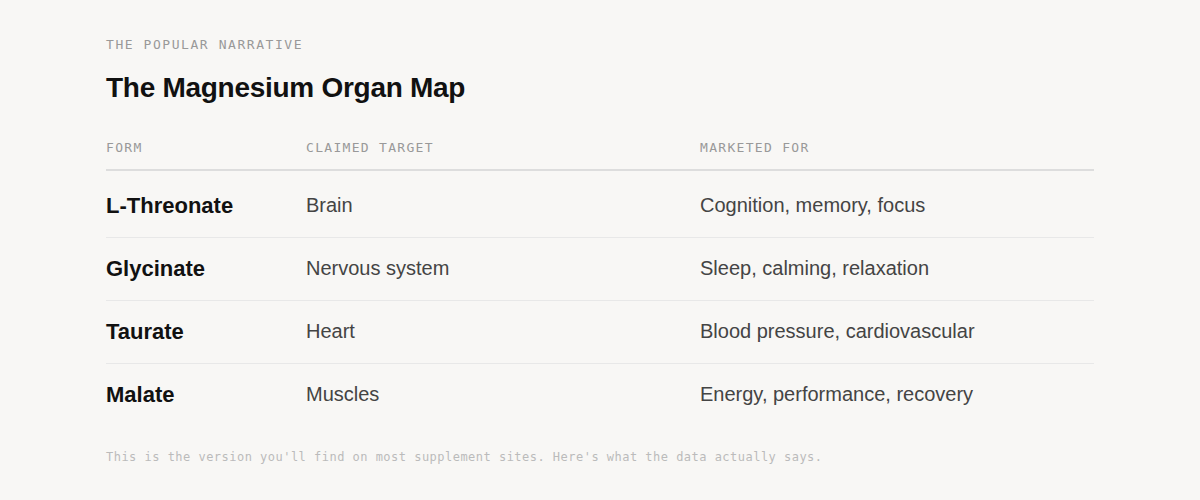If you've spent any time looking into magnesium supplements, you've encountered the same claim repeated across brands, influencers, and Reddit threads: each magnesium form targets a specific organ. Threonate for brain. Glycinate for sleep. Taurate for heart. Malate for energy. It's clean, intuitive, and almost entirely unsupported by human data.
