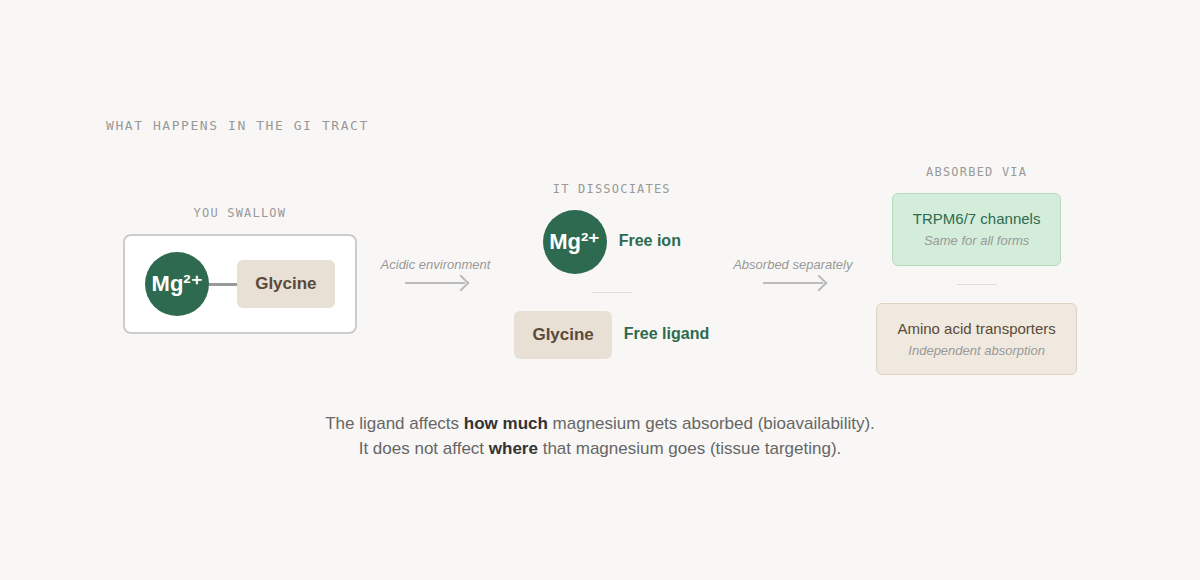 What the ligand does clearly affect is how quickly dissociation happens and where in the GI tract it occurs, which influences how much total magnesium is available for absorption. That's bioavailability. But bioavailability is not the same thing as tissue targeting. A more bioavailable form puts more total Mg²⁺ into circulation. It doesn't route that magnesium to a specific organ.
