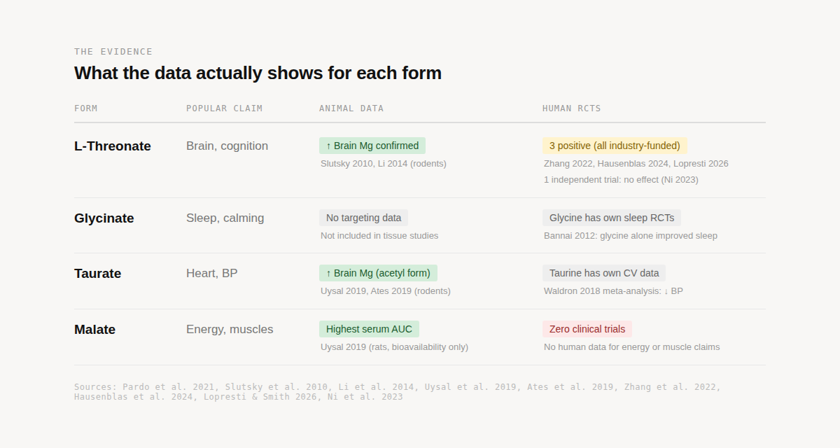 Here's what holds up: organic forms (glycinate, citrate, threonate, taurate, malate) are generally better absorbed than inorganic forms like oxide or sulfate.¹ If you're supplementing, choosing an organic form is reasonable. Magnesium L-threonate has the most research specifically behind its organ-targeting claim, including animal data showing genuine brain tissue penetration⁴,⁵ and three human RCTs showing cognitive and sleep benefits⁷,⁸,⁹ (though all three were industry-funded and none measured brain magnesium directly). Magnesium acetyl taurate showed the highest brain tissue levels in the only multi-form rodent comparisons we have (that, again, did not compare to magnesium L-threonate).³,⁶