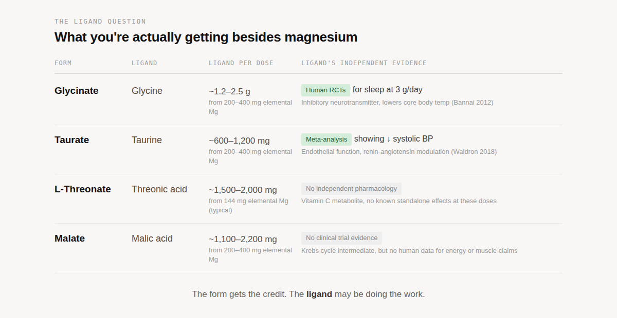 This is the attribution problem at the center of the magnesium form debate. When someone takes magnesium glycinate and sleeps better, they credit the magnesium form. But they may be responding to the glycine. When someone takes magnesium taurate and sees lower blood pressure, they may be responding to the taurine (although magnesium itself has been shown to lower blood pressure in people with inadequate magnesium intake). The form gets the credit. The ligand may be doing the work.