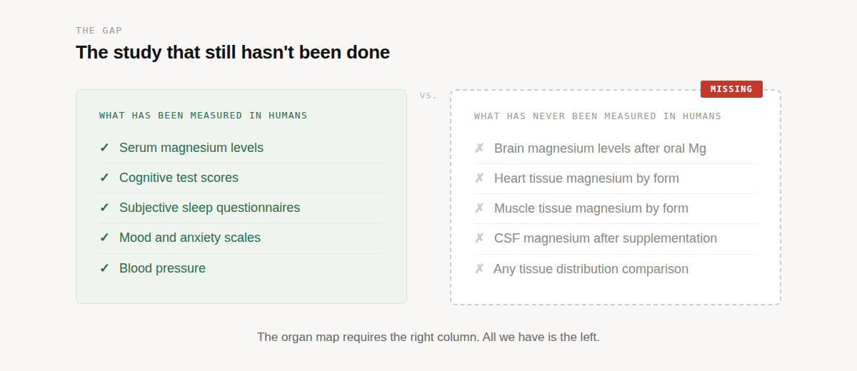 The organ map will probably keep circulating. It's simple, it's visual, it sells product. But until someone actually measures magnesium levels in human brain, heart, or muscle tissue after oral supplementation (the study that still hasn't been done), it remains a marketing framework built on rodent data and assumptions.